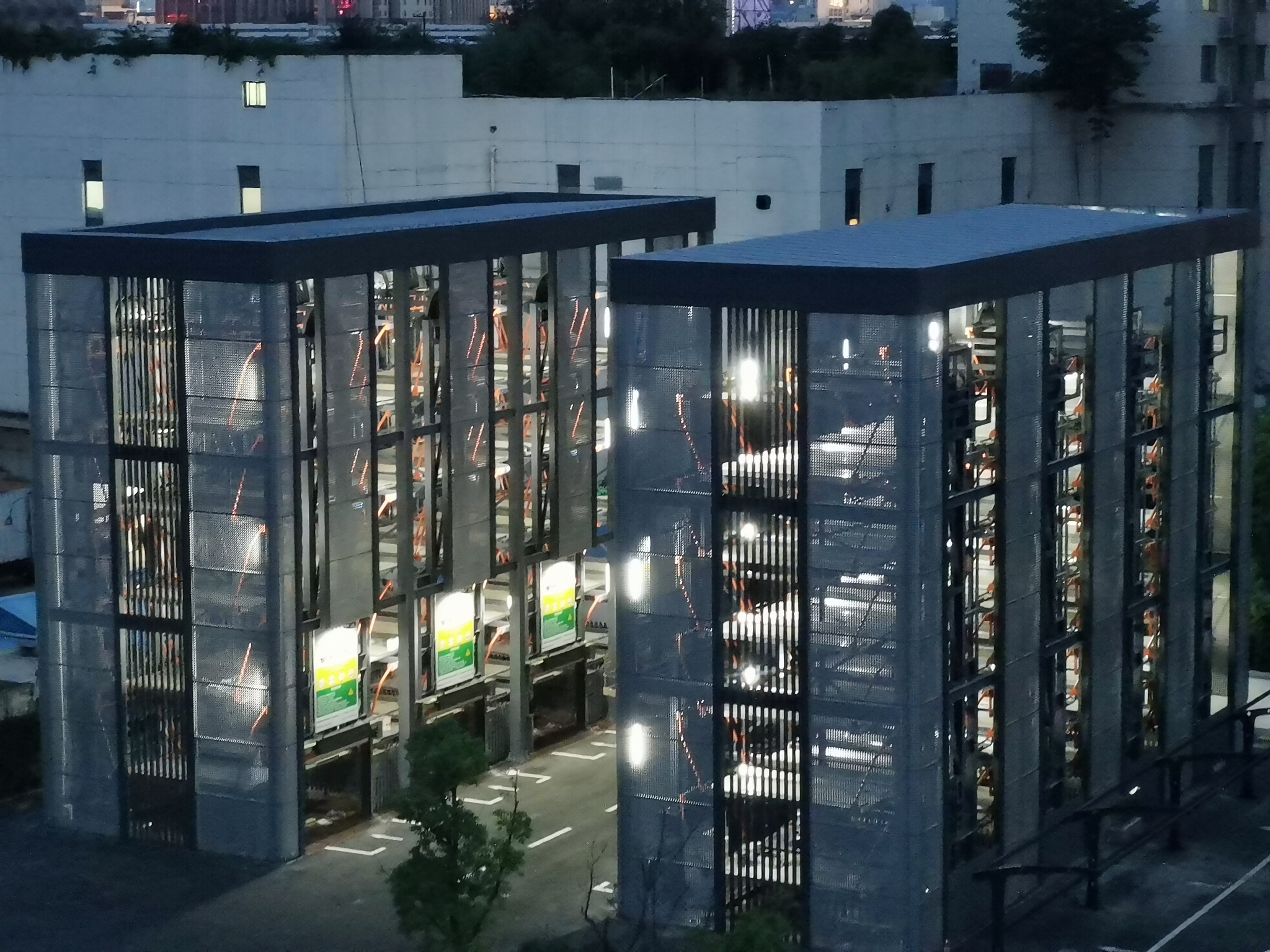 白天,藍(lán)天綠樹(shù)掩映下,兩座車(chē)庫(kù)古樸大氣,和整個(gè)移動(dòng)園區(qū)環(huán)境和諧一體。晚上,車(chē)庫(kù)有亮化效果,燈光打開(kāi)后成為夜晚中“最亮的崽”。